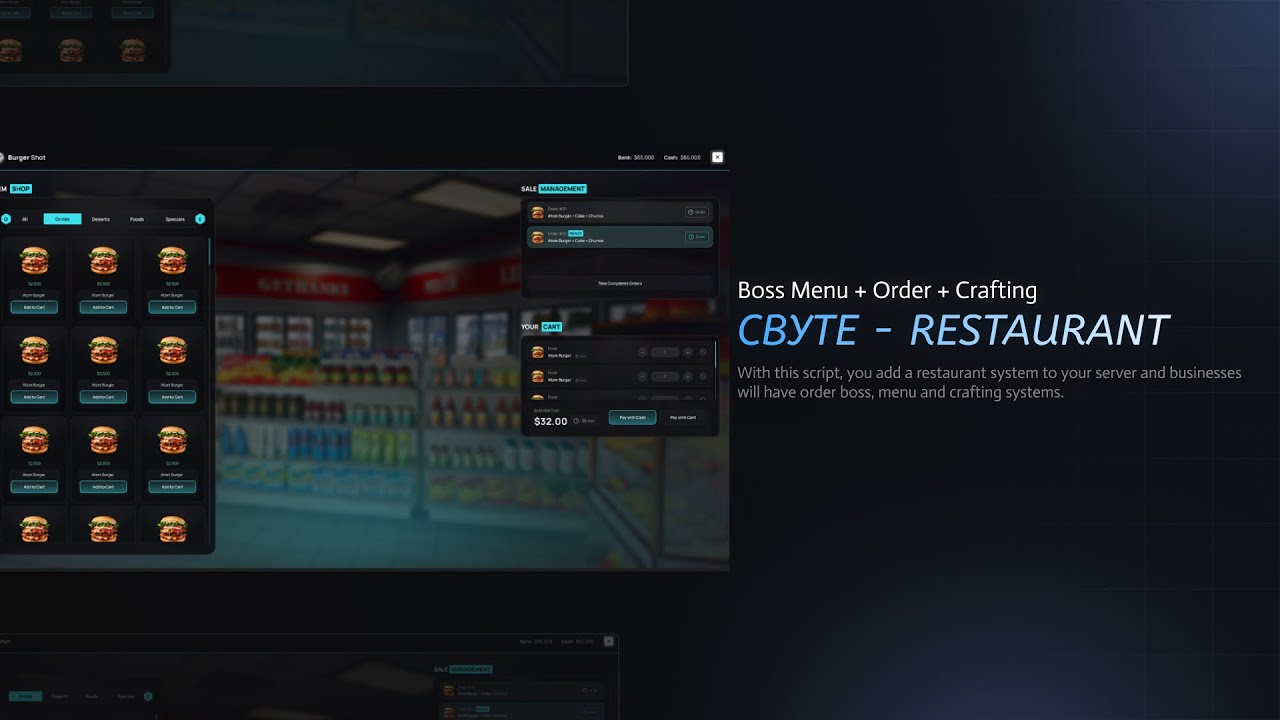 ○ With this script, you add a restaurant system to your server and businesses will have order boss, menu and crafting systems.