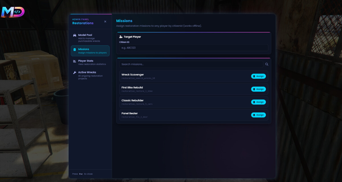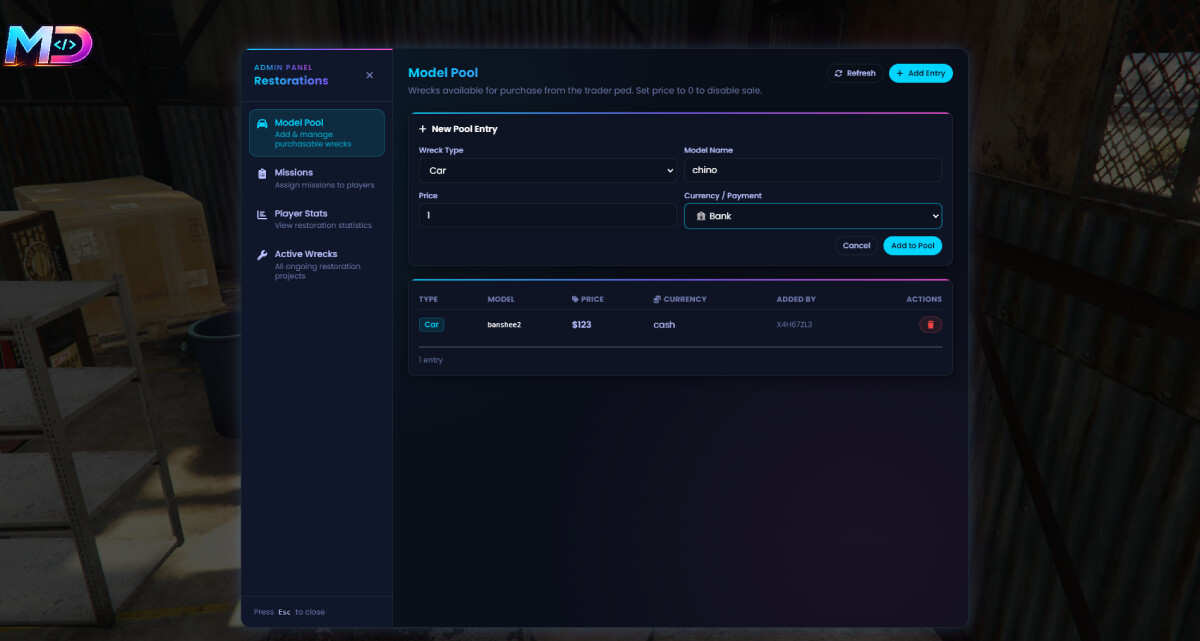 /restoration_admin) — full NUI panel with five management pages (Model Pool, Store, Missions, Player Stats, Active Wrecks). -
