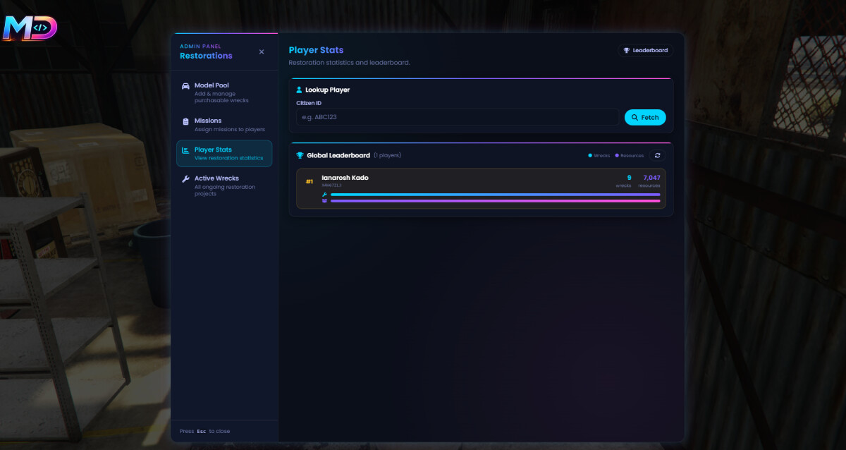 Transform rusted-out scrap heaps into roaring machines. metaden-restorations is a deep, multi-stage vehicle restoration gameplay resource for FiveM servers — complete with scrap searching, part crafting, skill progression, a trader NPC, engine hoisting, tow-truck transport, an in-game admin panel, and a global leaderboard. Every wrench turn matters.