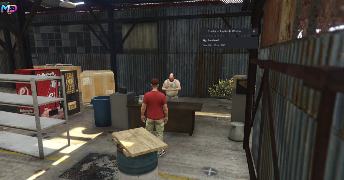 Trader NPC — a world-placed ped lets players browse and purchase wrecks from the model pool for cash or bank, and browse a live item store to buy parts and materials directly.