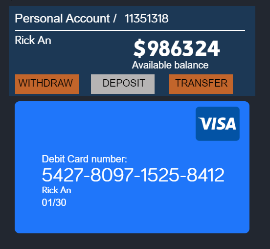 -Having personal information displayed is quite nice, but why have it say you’re a policer officer? Doesen’t change the banks function, seems like fill, that isn’t really important. If you want to fill out stuff, then have a small box, with some “bank” information about yourself. (Full name, gender, phonenumber, amount of accounts, how many disabled, current balances)
