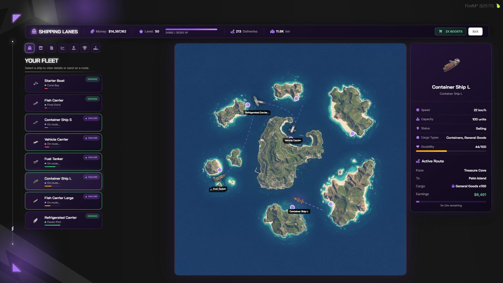 /shippingboostmoney,/shippingboostxp— full control from console or in-game. - Highly Configurable – Ships, ports, cargo types, crew, upgrades, events, captains, durability, contracts, and all UI strings are fully adjustable in config.lua and locales.lua.