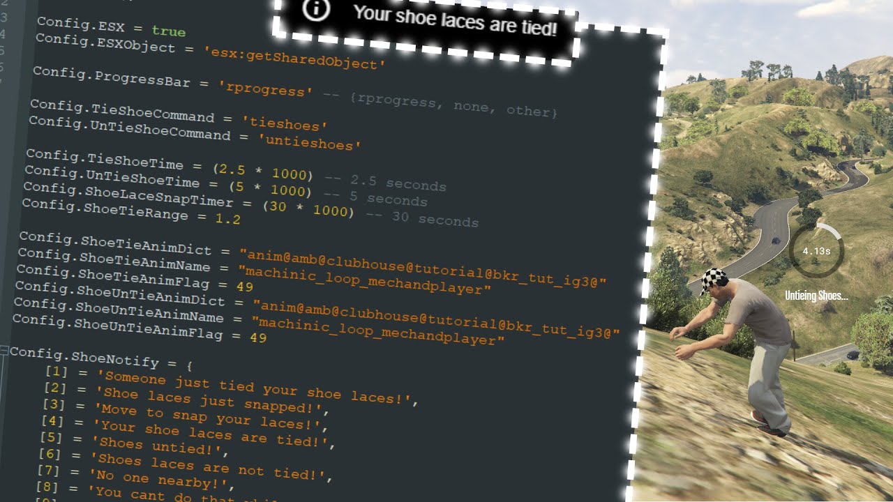 Distance check so the target can run away and avoid getting their shoes tied Afk Check so the shoe laces dont snap when the player is not active Extensive Config