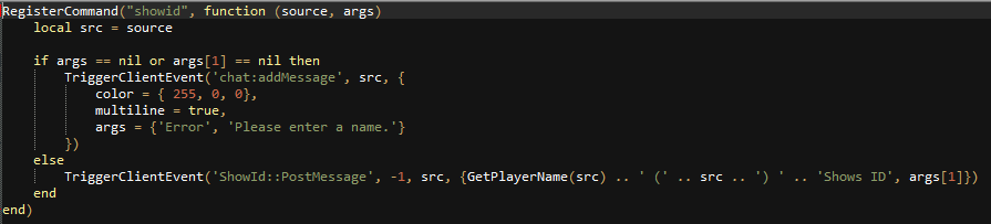 TriggerClientEvent('ShowId::PostMessage', -1, src, {GetPlayerName(src) .. ' (' .. src .. ') ' .. 'Shows ID', args[1].." "..args[2]})