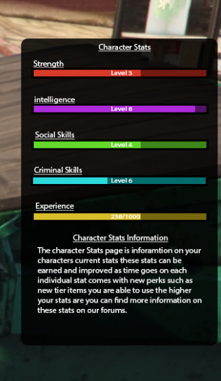 Character stats can be a insentive and a plus for those who continuesly play on your server and continuesly grind and adds more value to items and more reason to do random tasks such as going to the gym or even going to socialize with people hosting parties or even just going around lockpicking houses/cars/doors, This is something that will provide some great incentive to continue playing let me know what you think about it?