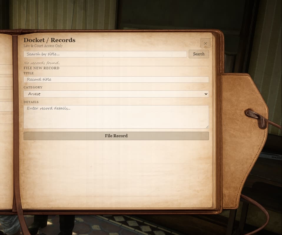 Characters holding authorized offices (Sheriff, Judge, DA, ADA, Clerk) can file official court and arrest records with a title, body, and category. All players can browse the public docket. Categories are fully configurable.