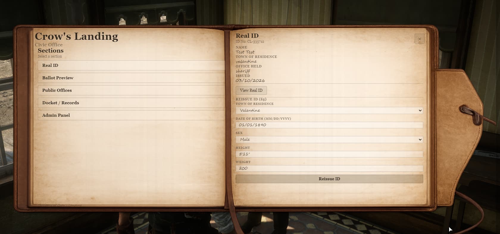 A hidden network of forger NPCs lets players obtain a false identity — different name, town, and office title. Fake IDs can be shown like real ones. Players can even run for civic office under their alias, with the ballot displaying the fake name while the actual office and job are always assigned to the real character underneath. Admins can search by real or fake name at any time to reveal the truth.