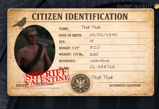 Players register at any Government Office NPC to receive an official ID card displaying their full name, date of birth, sex, height, weight, town of residence, and ID number. A photo can be attached via Discord CDN URL. Characters who hold civic office have a stamped seal automatically added to their card. IDs can be shown to nearby players, reissued, and updated at any time.
