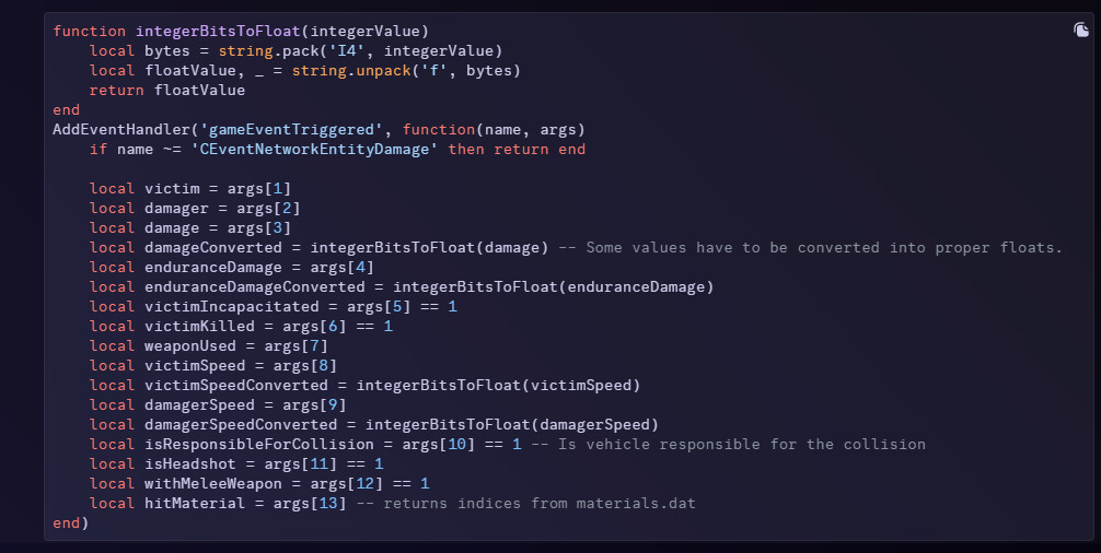 Recently I’ve been testing the gameEventTriggered - Cfx.re Docs event. In theory, this event should be able to take care of game checks, like entity damage, “ped entered vehicle” or “vehicle is destroyed / undrivable”.