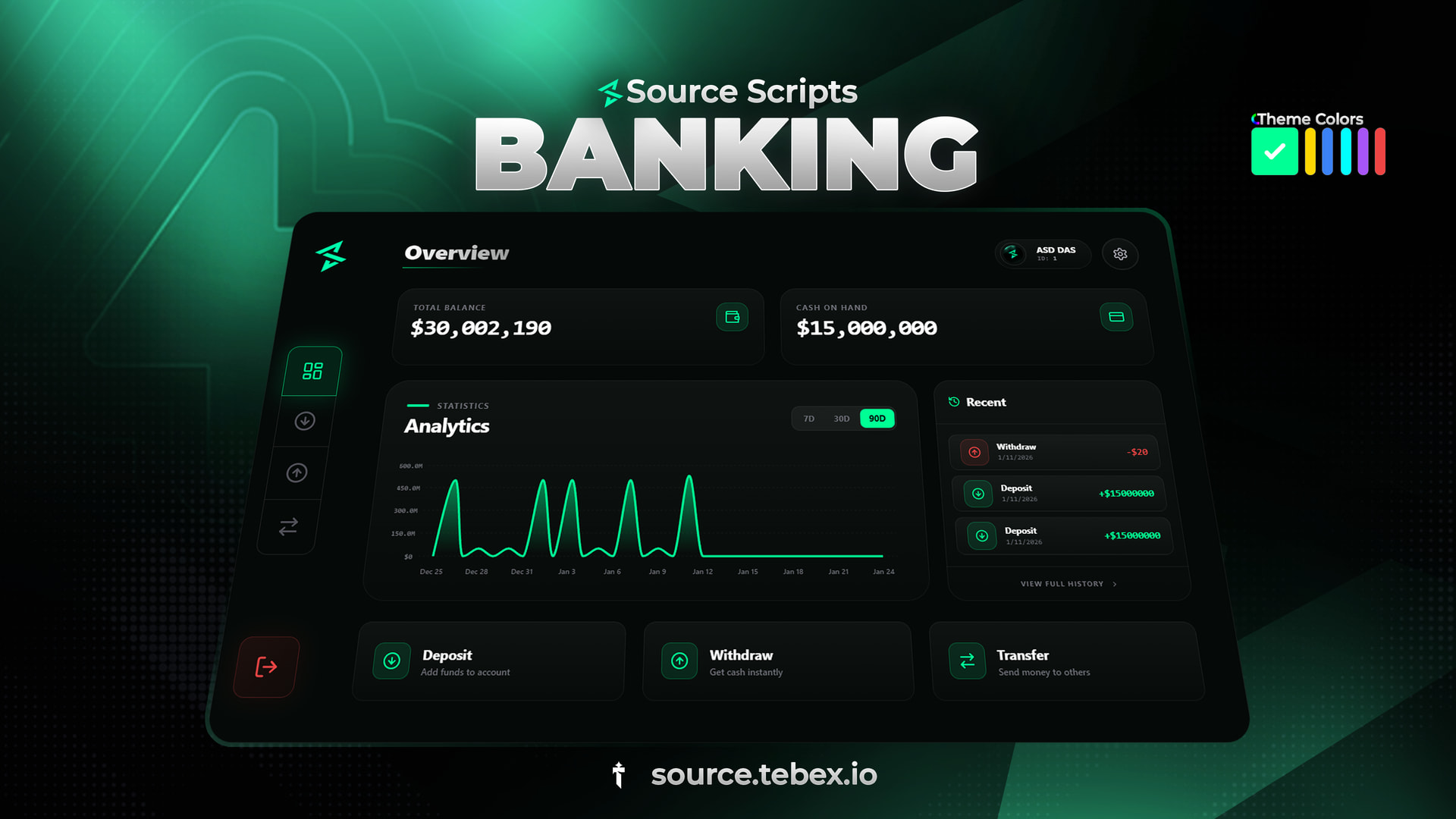 Advanced Banking is a production-ready banking system for FiveM: full NUI for branches and ATMs, framework-aligned cash and bank balances, and secure PIN flows — without bloated dependencies.