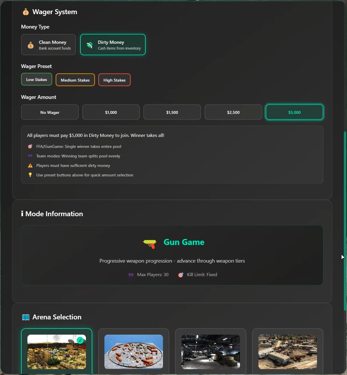 Run fast, fair, and competitive arena matches with a fresh UI, multi-lobby support, wagers, attachment support, and a stack of performance-focused improvements.