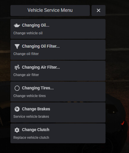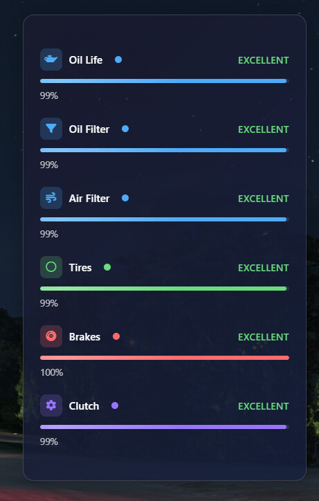A comprehensive vehicle maintenance and mileage tracking system for FiveM servers that simulates realistic vehicle wear and tear, including oil life, filters, tires, and brake conditions. The system tracks vehicle mileage and component wear, requiring regular maintenance to maintain optimal vehicle performance.