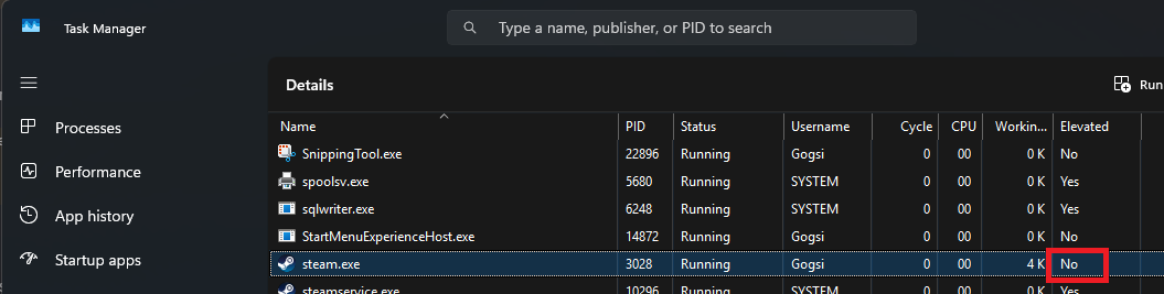 Scroll down until you find Steam and see what “Elevated” is (Yes or No)
