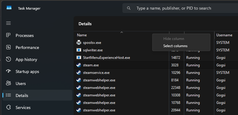 Right click on the columns (Name, PID, Status, etc) and select “Select columns”