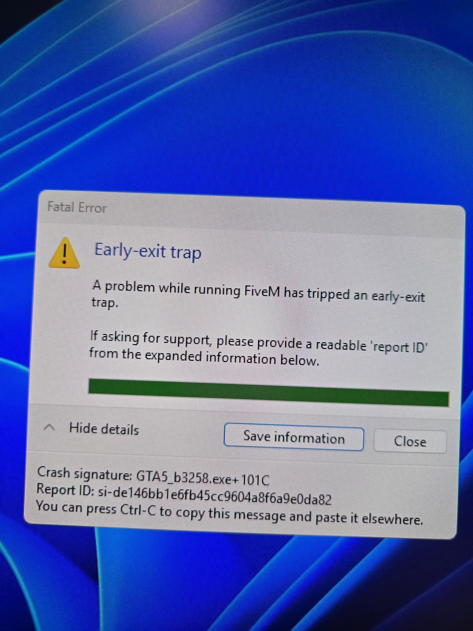 [ 1204125] [b3258_DumpServ] 20432/ An error at GTA5_b3258.exe!sub_140777E18 (0x5d) caused FiveM to stop working. A crash report is being uploaded to the FiveM developers.