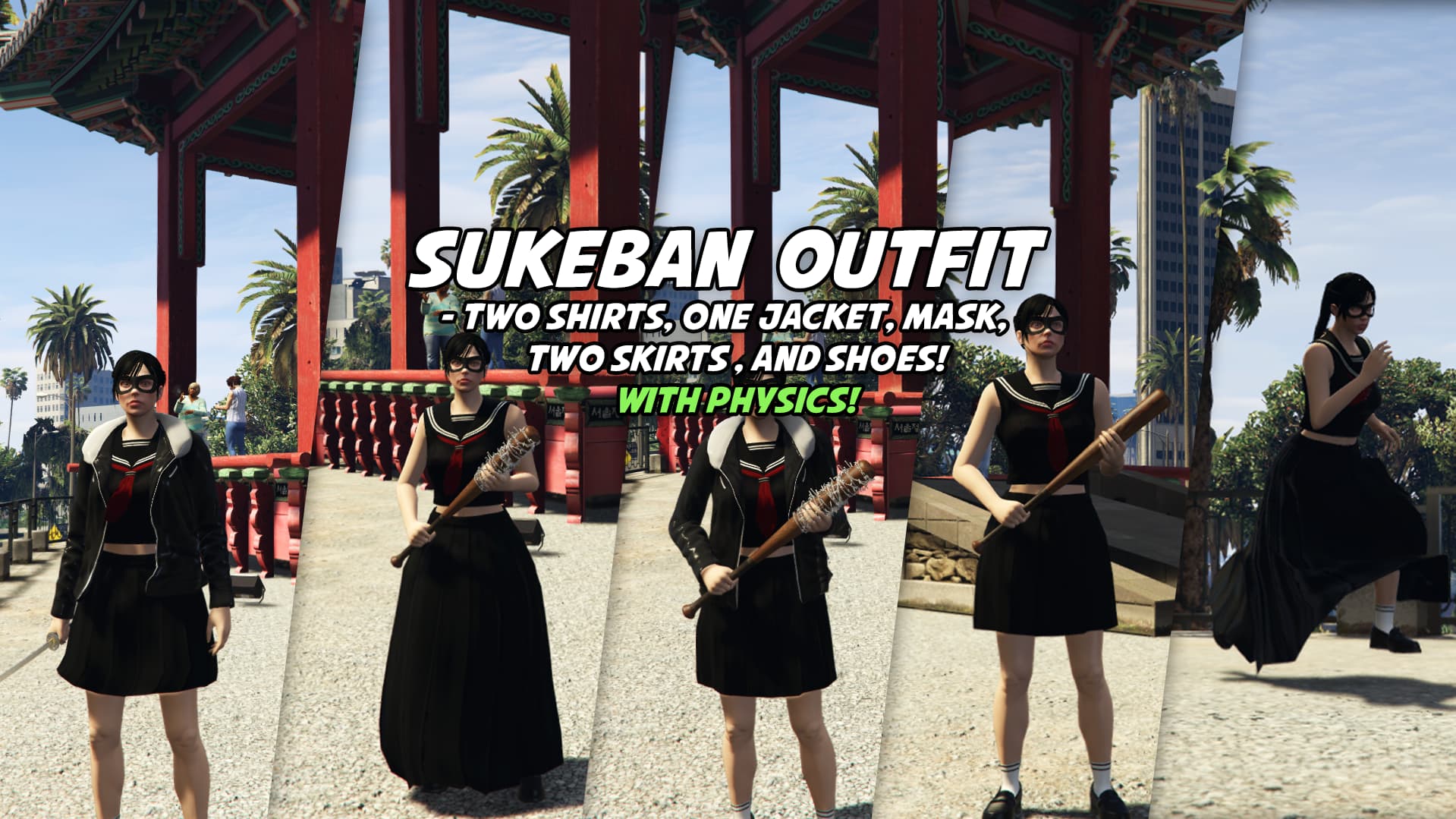 Whether it’s smoking, stealing, fighting, or anything else LSPD is too lazy to take action against, this Sukeban out fit and weapon set is tailor-made for your female gangs and criminals!