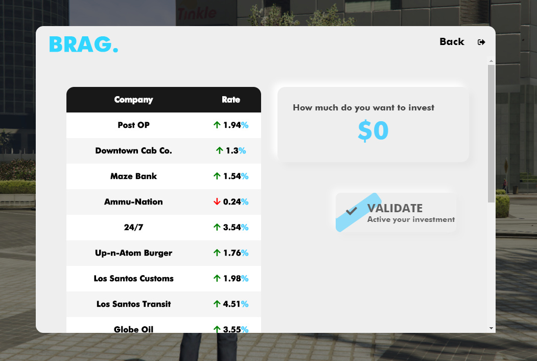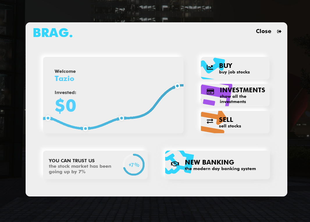 Today I’m introducing to you ESX Invest. I made this script a while ago but never finished it. So thanks to these corona times I got around and finished what I started. Without further ado here it is.