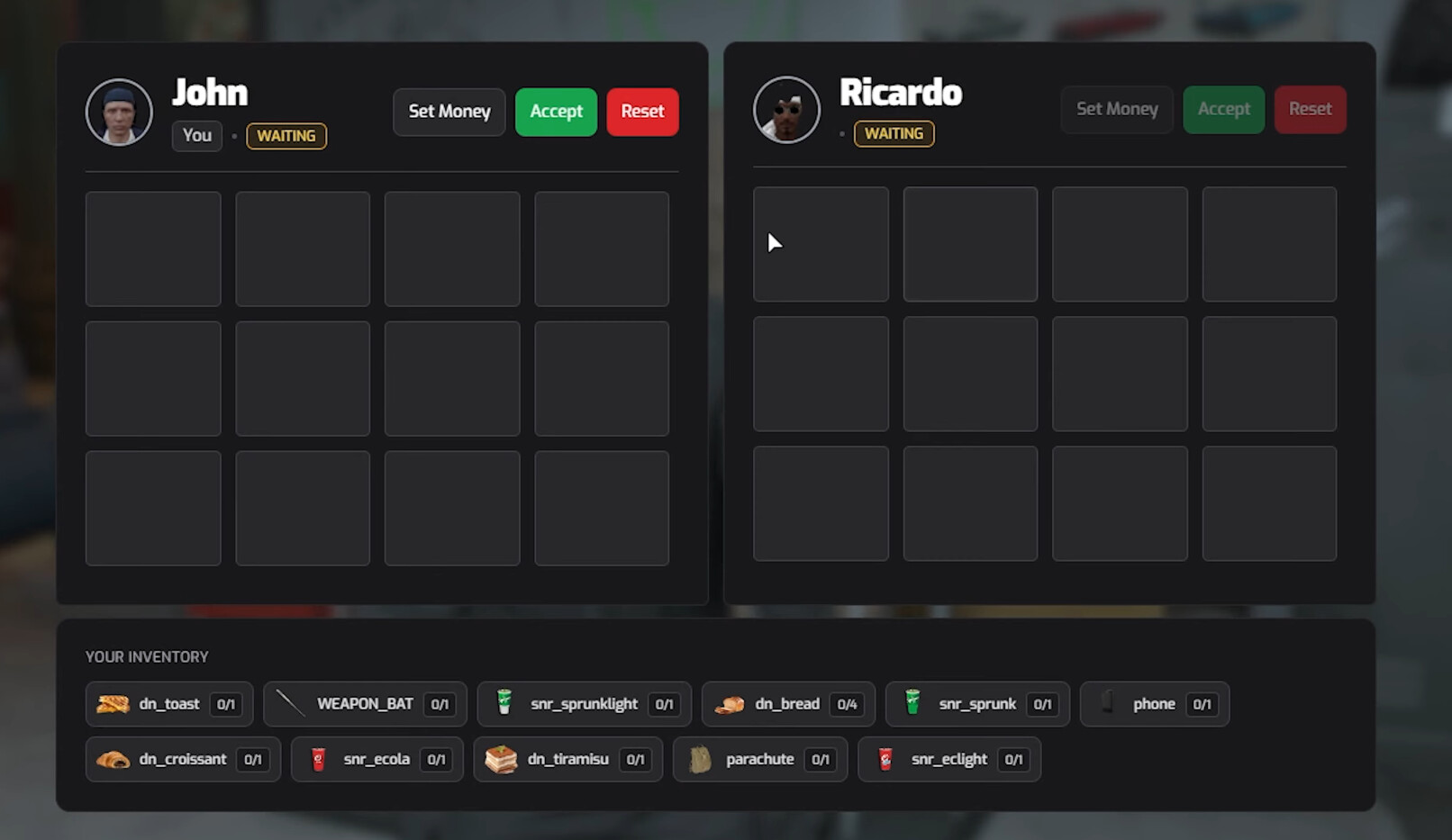 A secure, clean, and fully-synced trading system for safe item, weapon, and money exchanges with zero dupes or item loss.