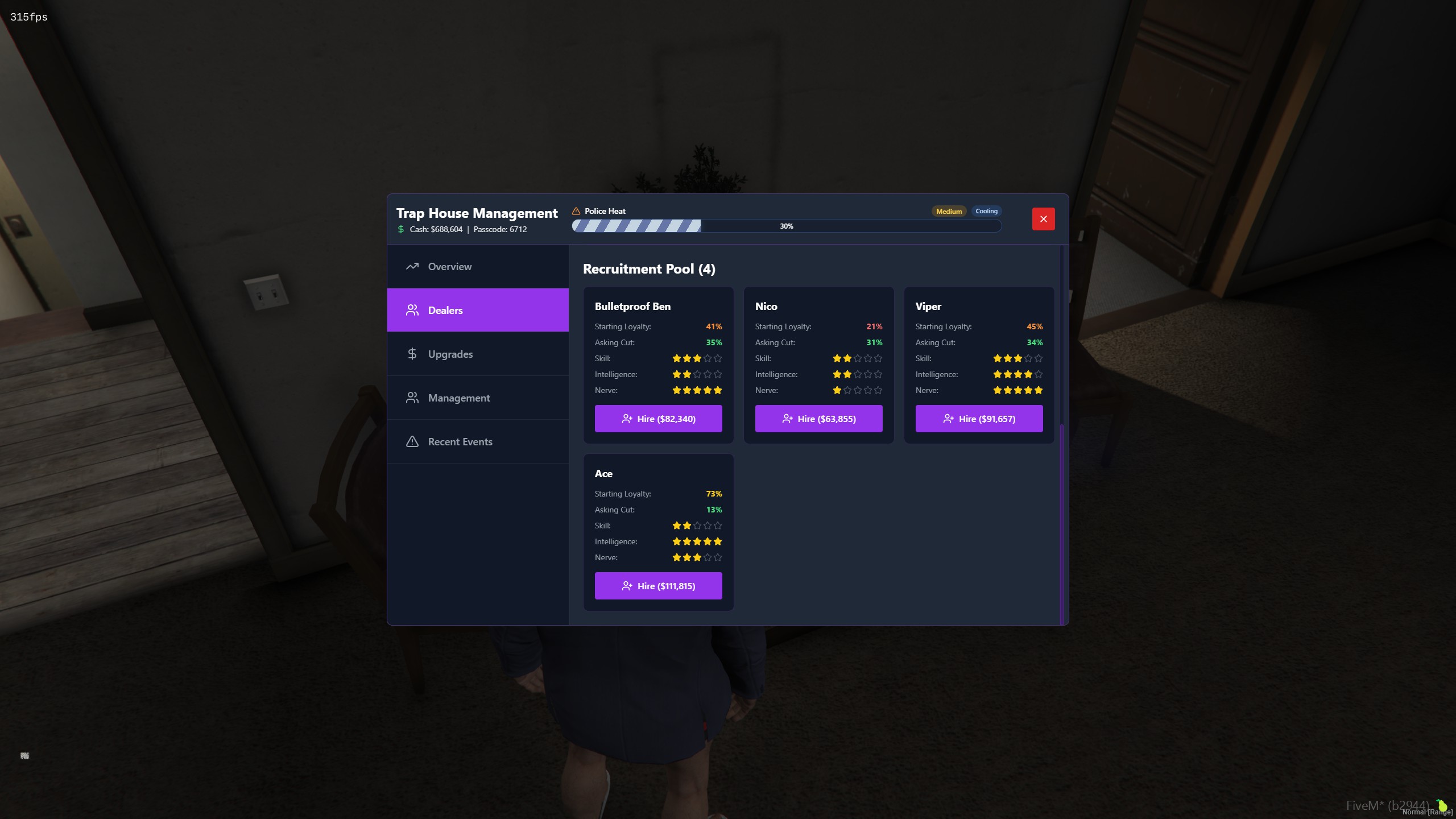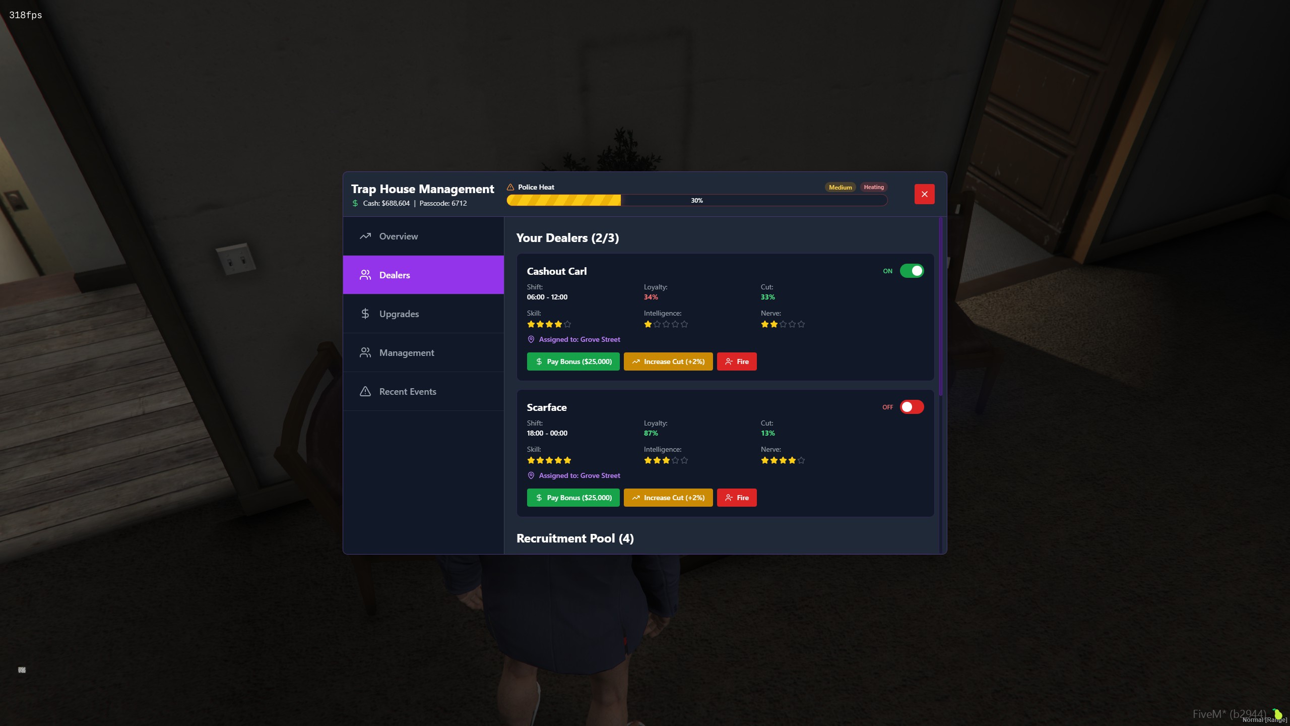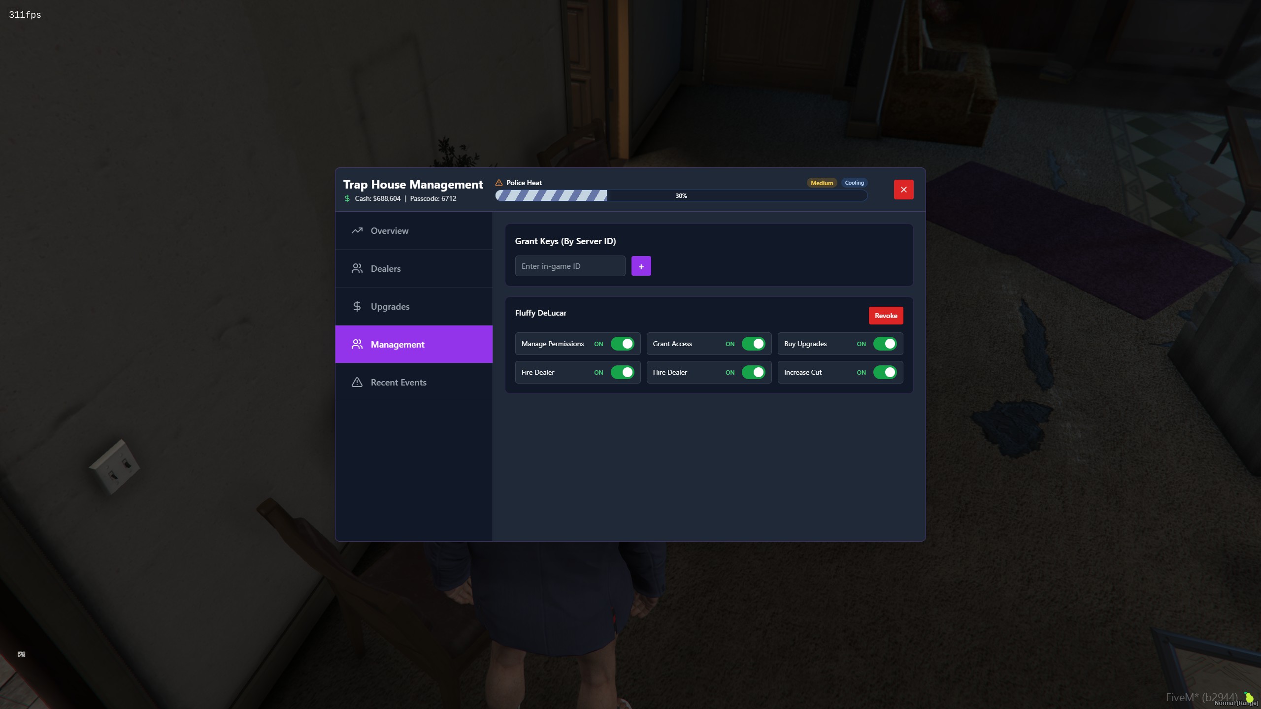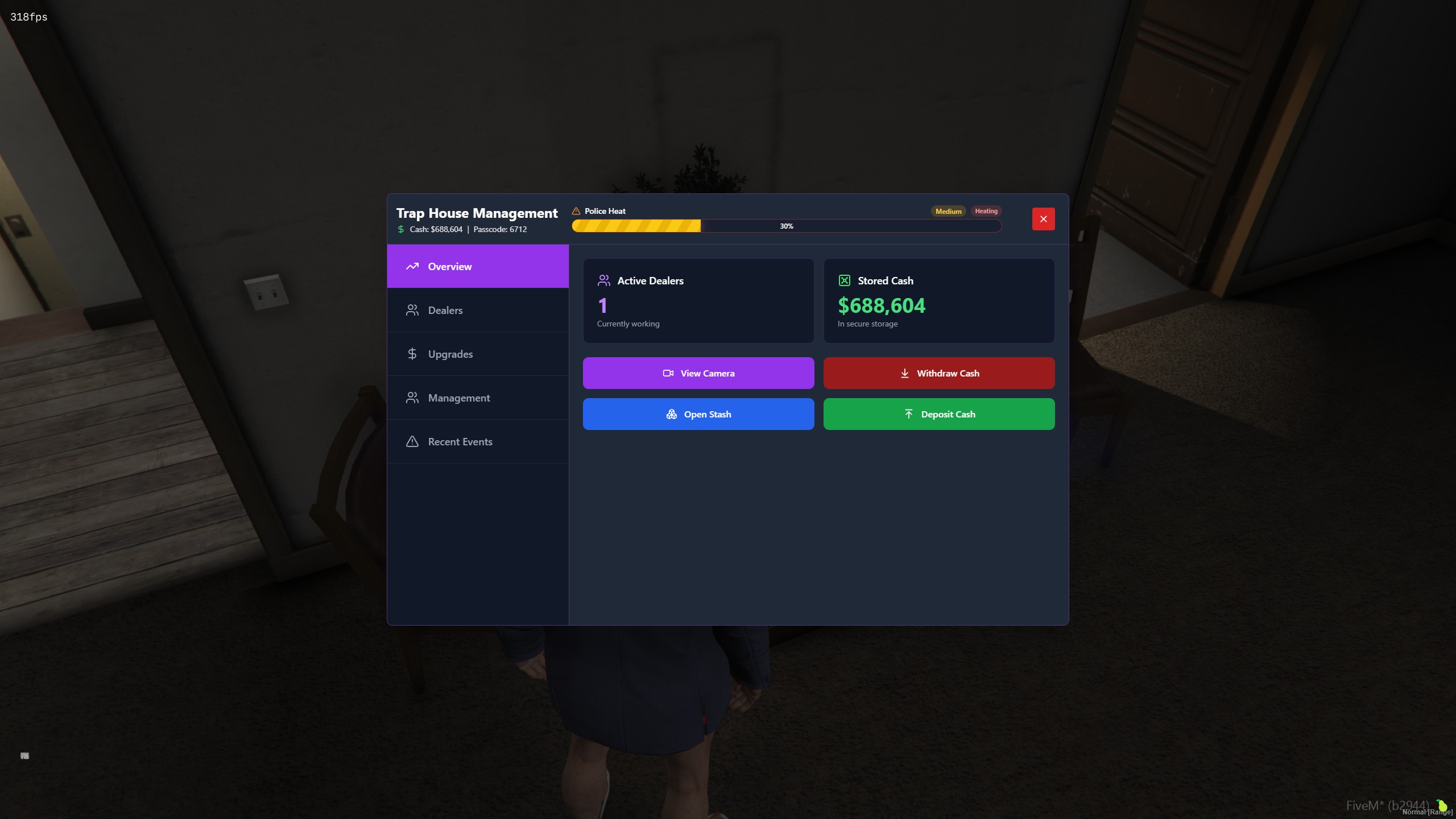 Full Trap House management UI (dealers, upgrades, cash, access)