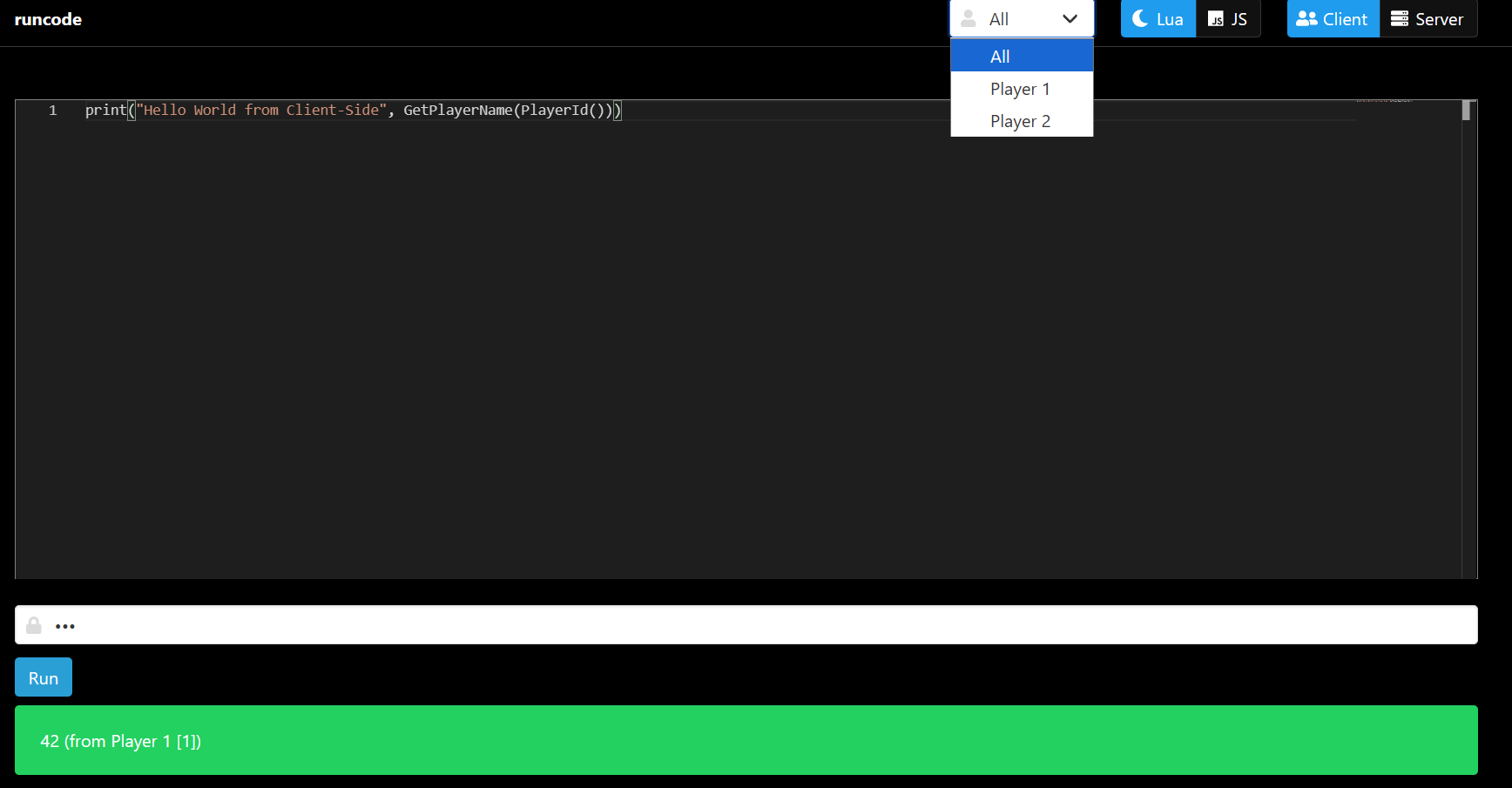 The last thing we’ll get familiar with in this part of the tutorial is running scripts through the RunCode visual interface. It will allow us to run both server scripts - those we ran with the run command, and client scripts - the crun command. Moreover, when running a client script we can select a specific player on which the script will be executed (or all players at once).