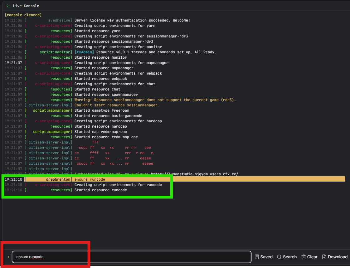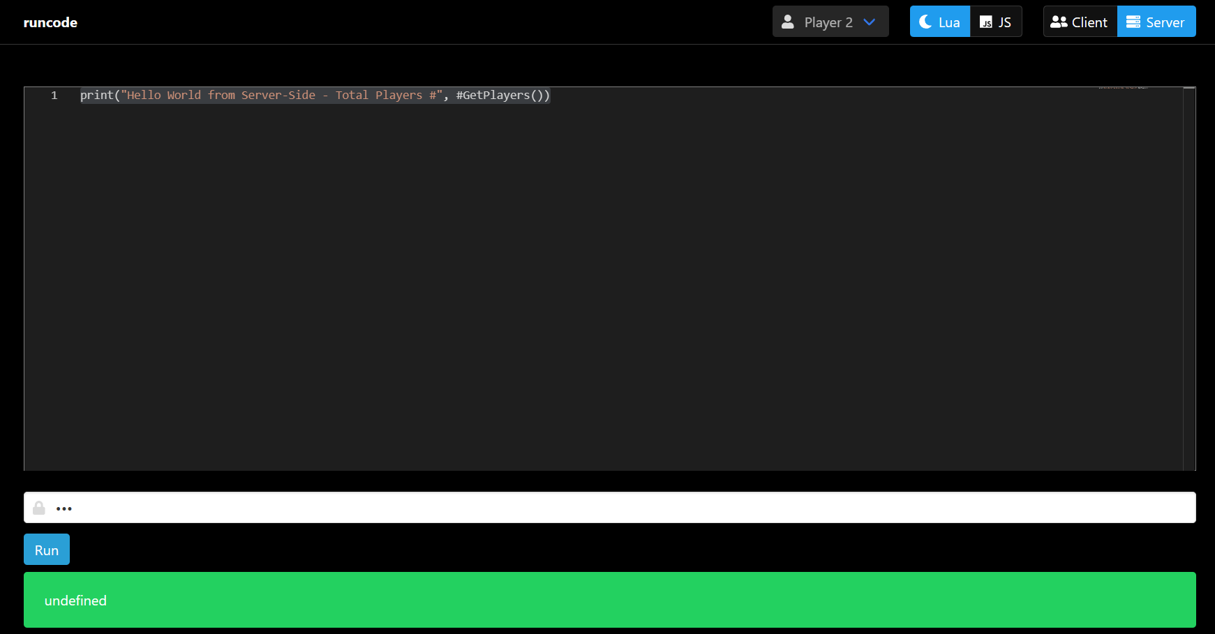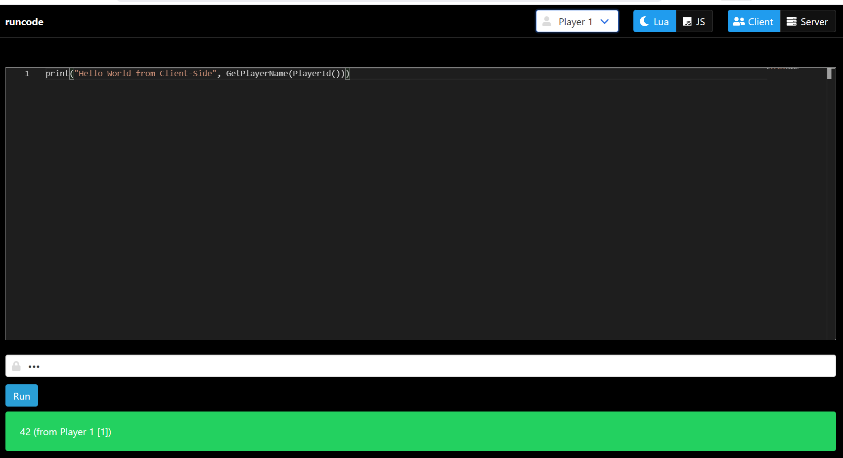 Now RESTART THE SERVER, run ensure runcode and try going to the RunCode website again http://127.0.0.1:30120/runcode. Enter your password and press the Run button. You should see the result of successful code execution.