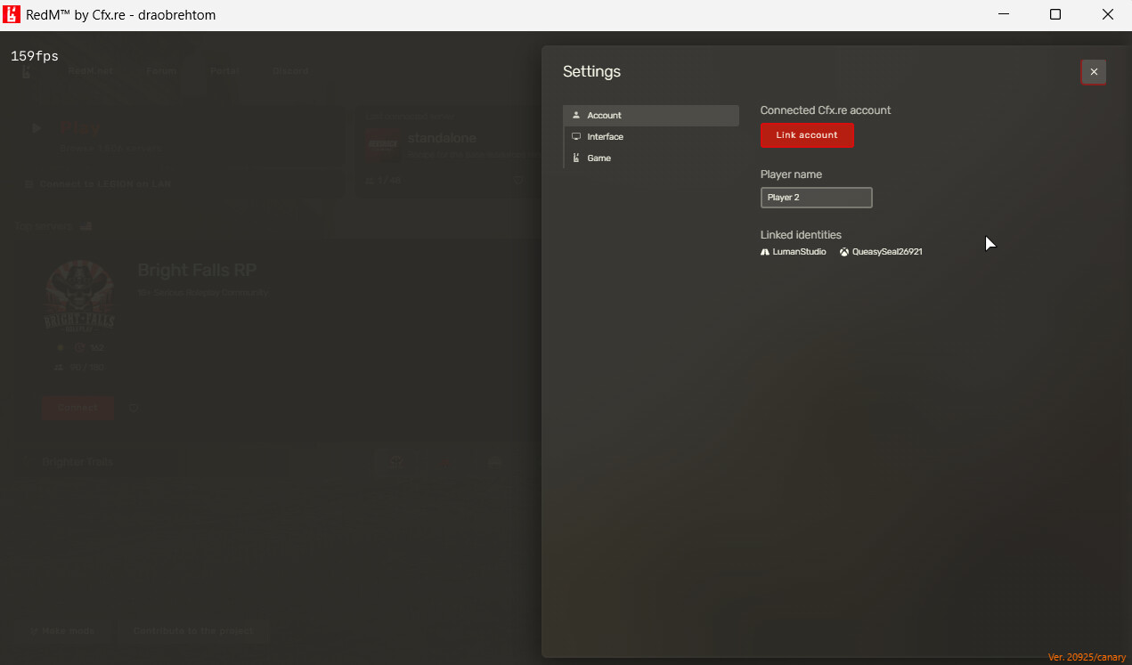Now launch the second client. For convenience, change the player name in RedM → Settings → Account → Player name. For example, set the name to “Player 2”.