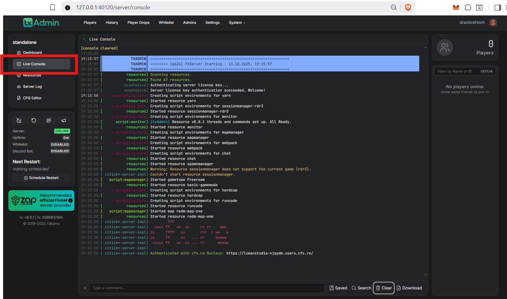 Start the server, go to http://127.0.0.1:40120/ and authorize (Login with Cfx.re). Click on Live Console in the menu on the left.