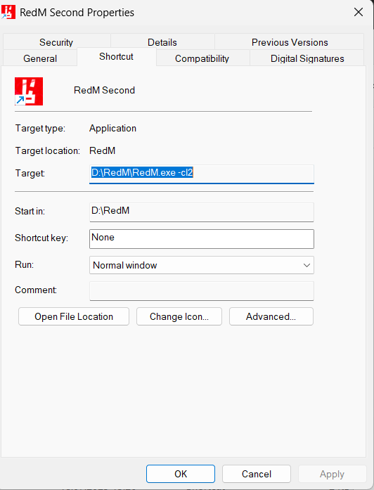 To test scripts with multiple players, you can run two RedM clients simultaneously on your PC. To launch a second client, you need to create a new RedM shortcut and in it Right Click → Properties → Target add the -cl2 flag. For example, here’s how it looks for me: