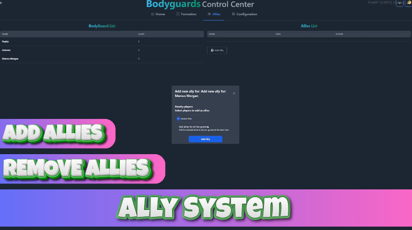 Add nearby players as allies, either individually for each bodyguard or for your entire squad. Allies will not be an objective for your bodyguards—keep them safe!