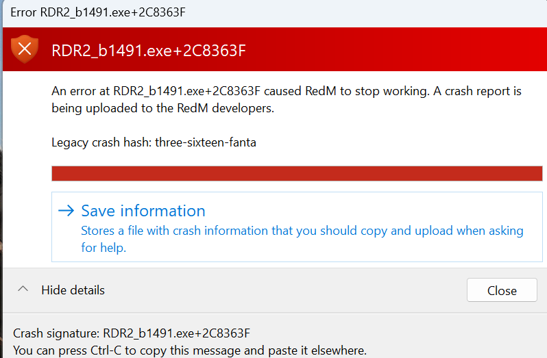 Hey everyone, can anyone help me out? I can’t open my RedM —every time I try to launch it, it crashes. It says something about RDR2_b1491.exe+2C836F causing RedM to stop working, and then there’s a legacy crash too with the reason three-sixteen-fanta.