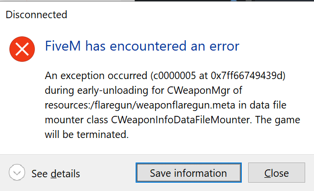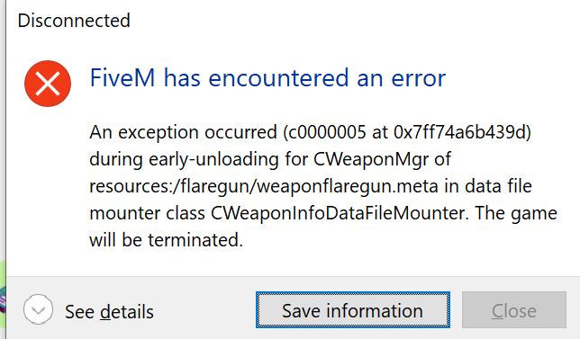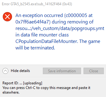 Fivem client crashes while unloading a custom popgroups.ymt file. Most of the mounter type data files(popcycle.dat/.ymt/ .ytyp) fail to unload while disconnecting from the server.