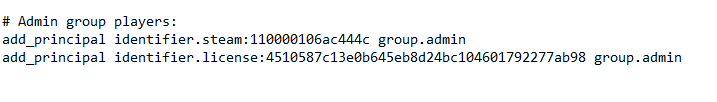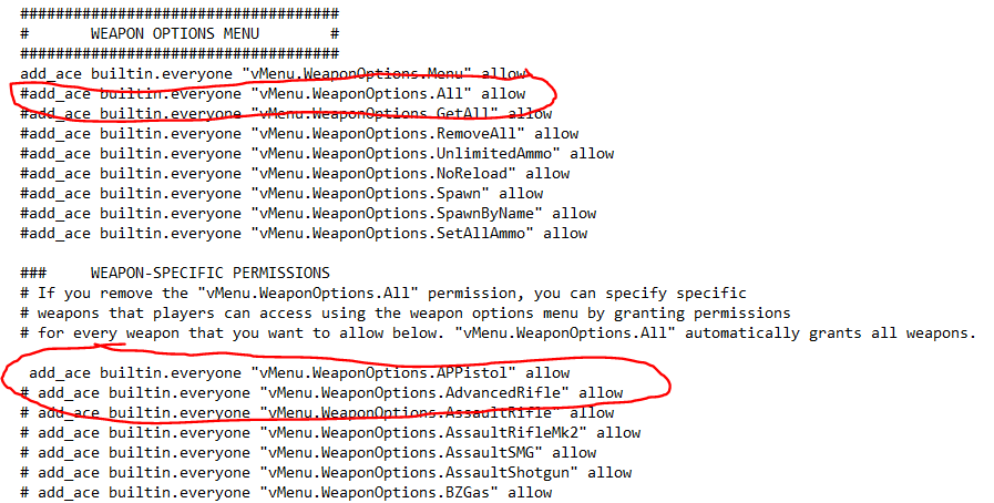 Hey I am having some issues with the permissions file. I have read the documentation several times. I have watched a video. But my permissions dont work quite right. I put my steam hex id in the spot for group.admin. I tried changing teleport from builtin.everyone to group.admin but my buddy was still able to teleport. I also commented out the vMenu.WeaponOptions.All so i can change which weapons are allowed. I then uncommented “add_ace builtin.everyone “vMenu.WeaponOptions.APPistol” allow”. This has the effect of all menus aside from pistol being locked but when i try and click on the APPistol in the menu I am notified i do not have permission. My friend tried it and he did not have permission either.