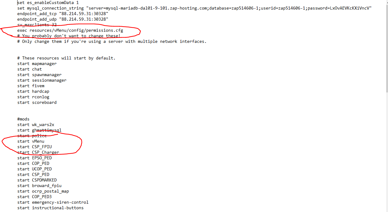 I have screen shots of all related lines in the server.cfg and the permissions.cfg that I have been able to determine are relevant. I have also cleared the cache folder on both the server and client to no avail. I am also on a zaphost server.