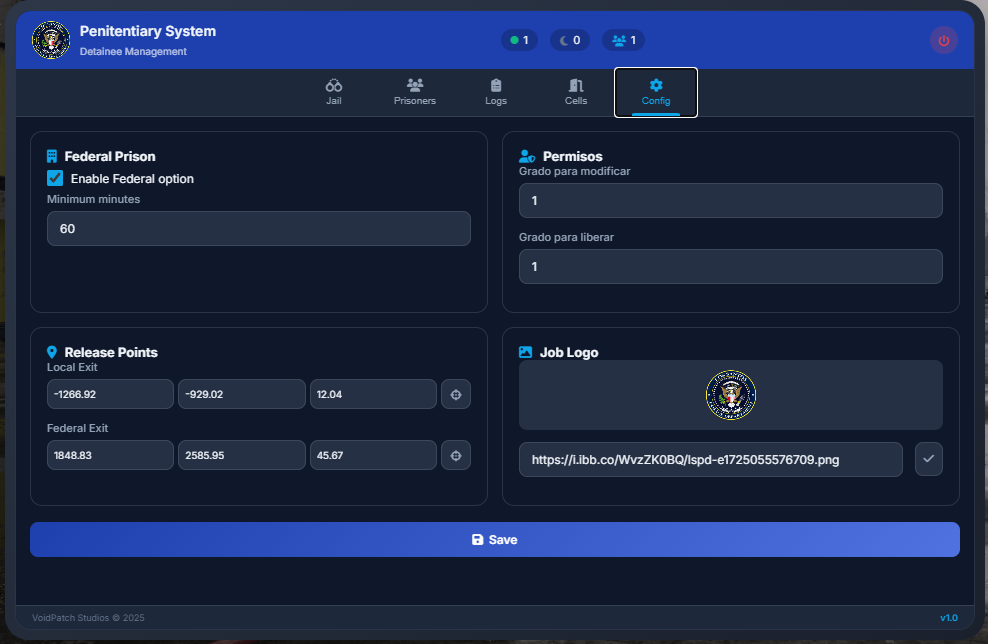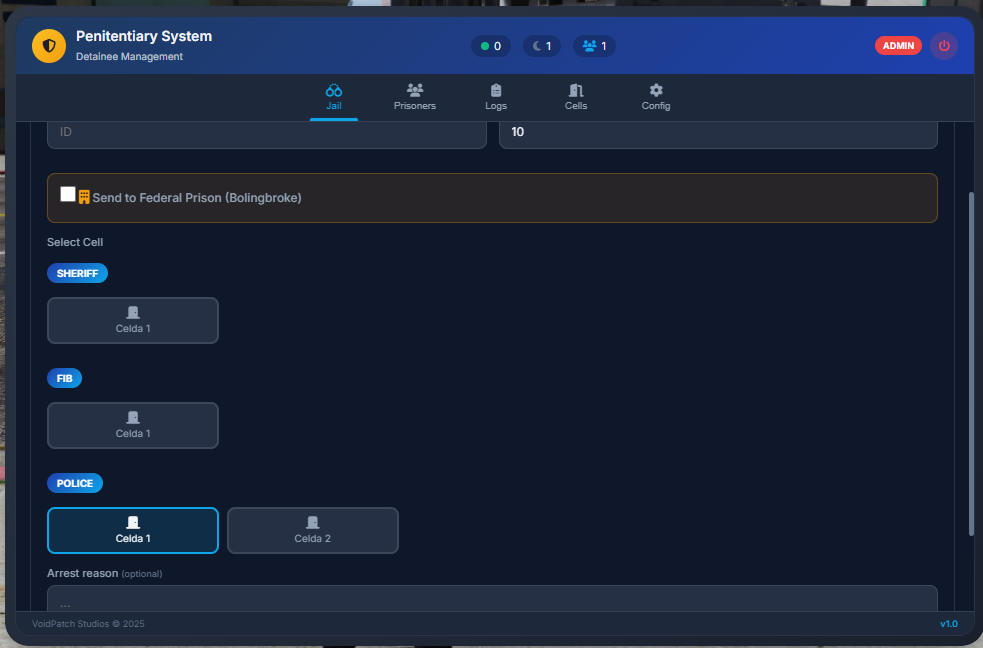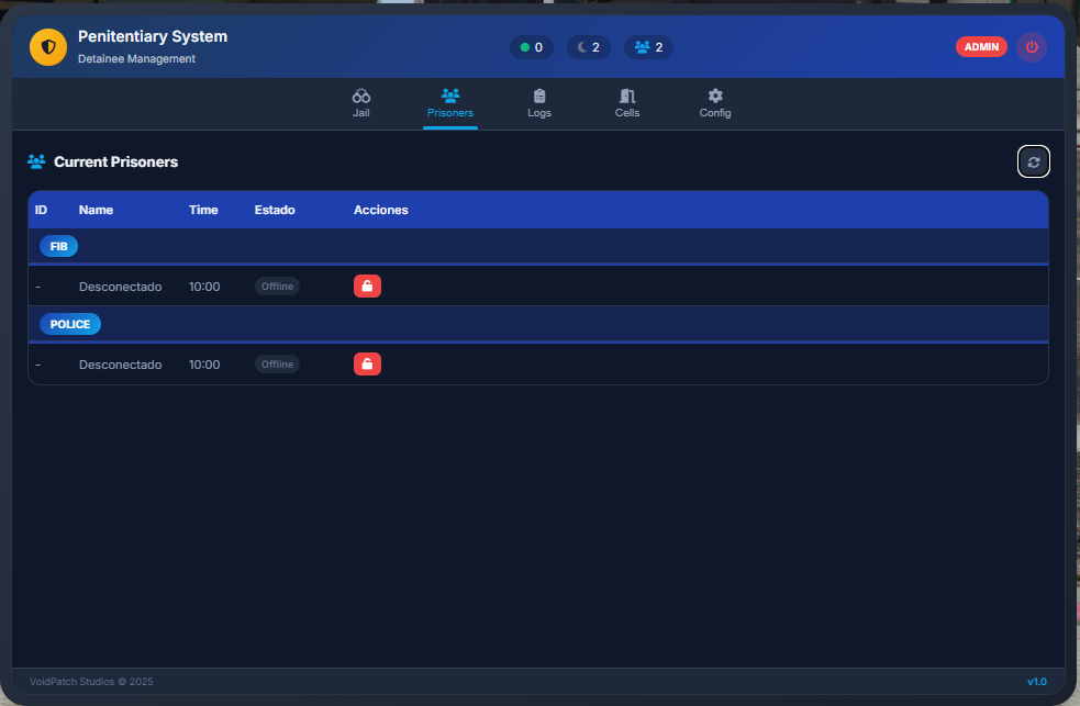 Designed for serious roleplay servers, it offers complete prison management with separation by jobs, global administrator mode, and a detailed permissions and logging system.