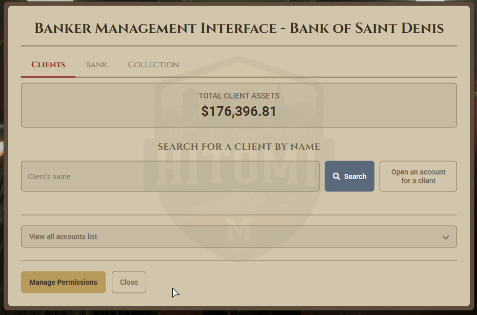 Client Management: The banker can Open an account, Freeze/Unfreeze an account (a powerful RP tool), and Search for any player to review their finances. -