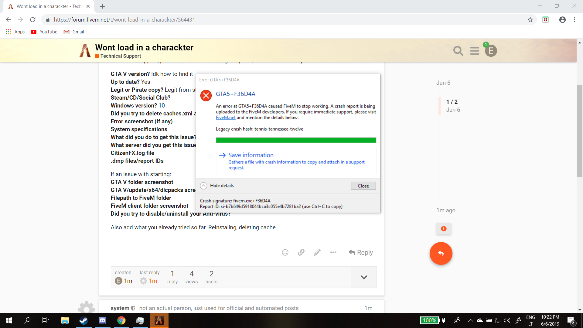 GTA V version? Idk how to find it Up to date? Yes Legit or Pirate copy? Legit from steam, but shared not bought Steam/CD/Social Club? Windows version? 10 Did you try to delete caches.xml and try again? Yes Error screenshot (if any)