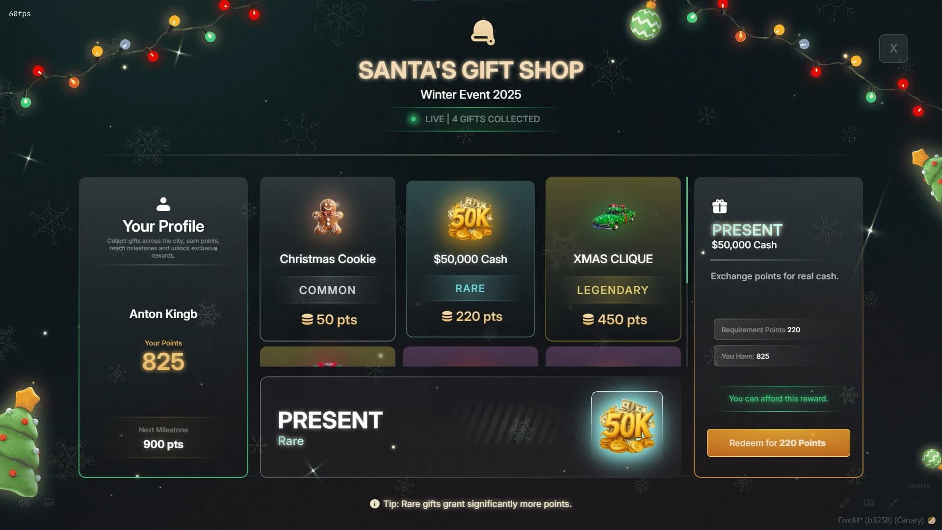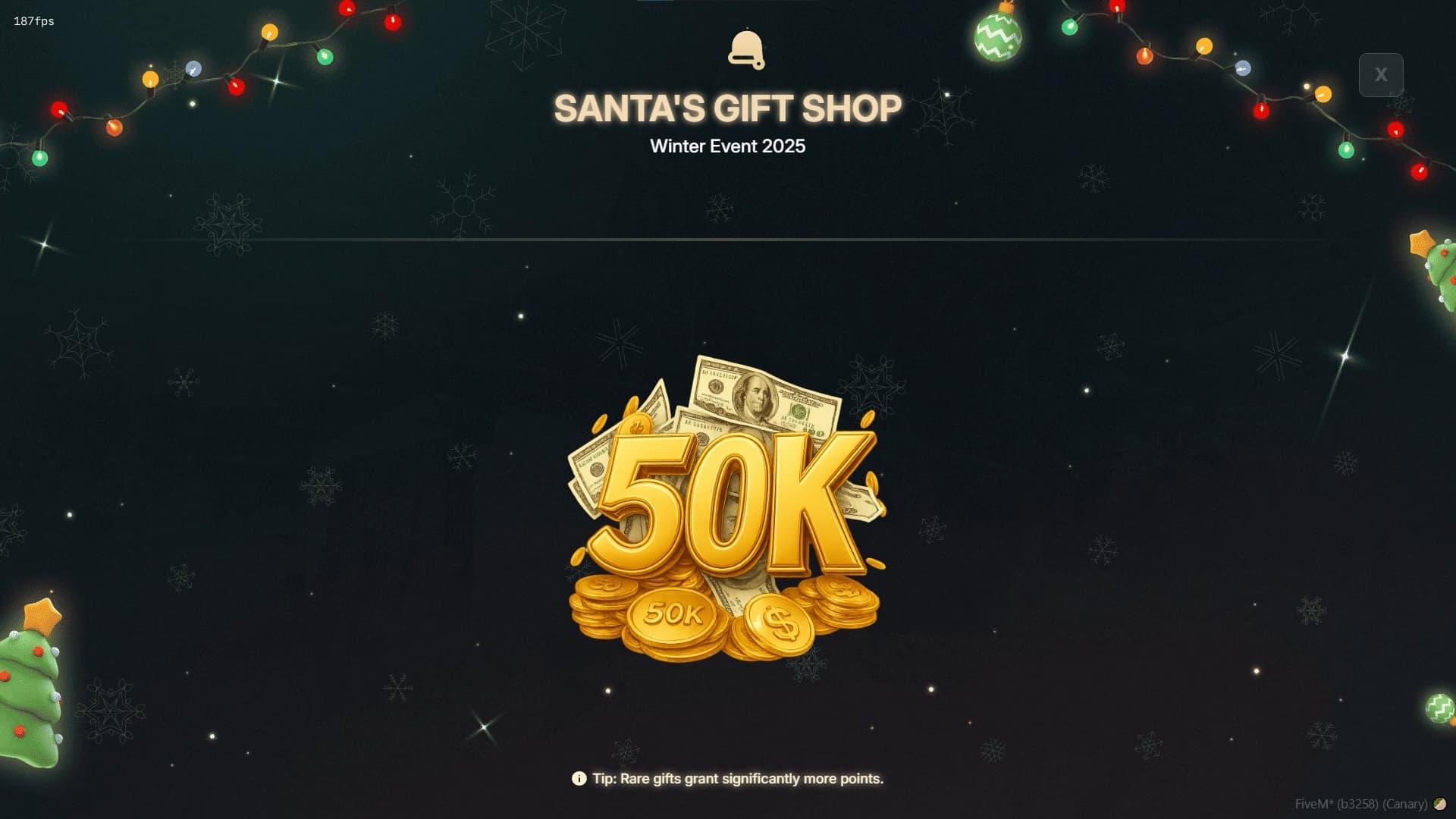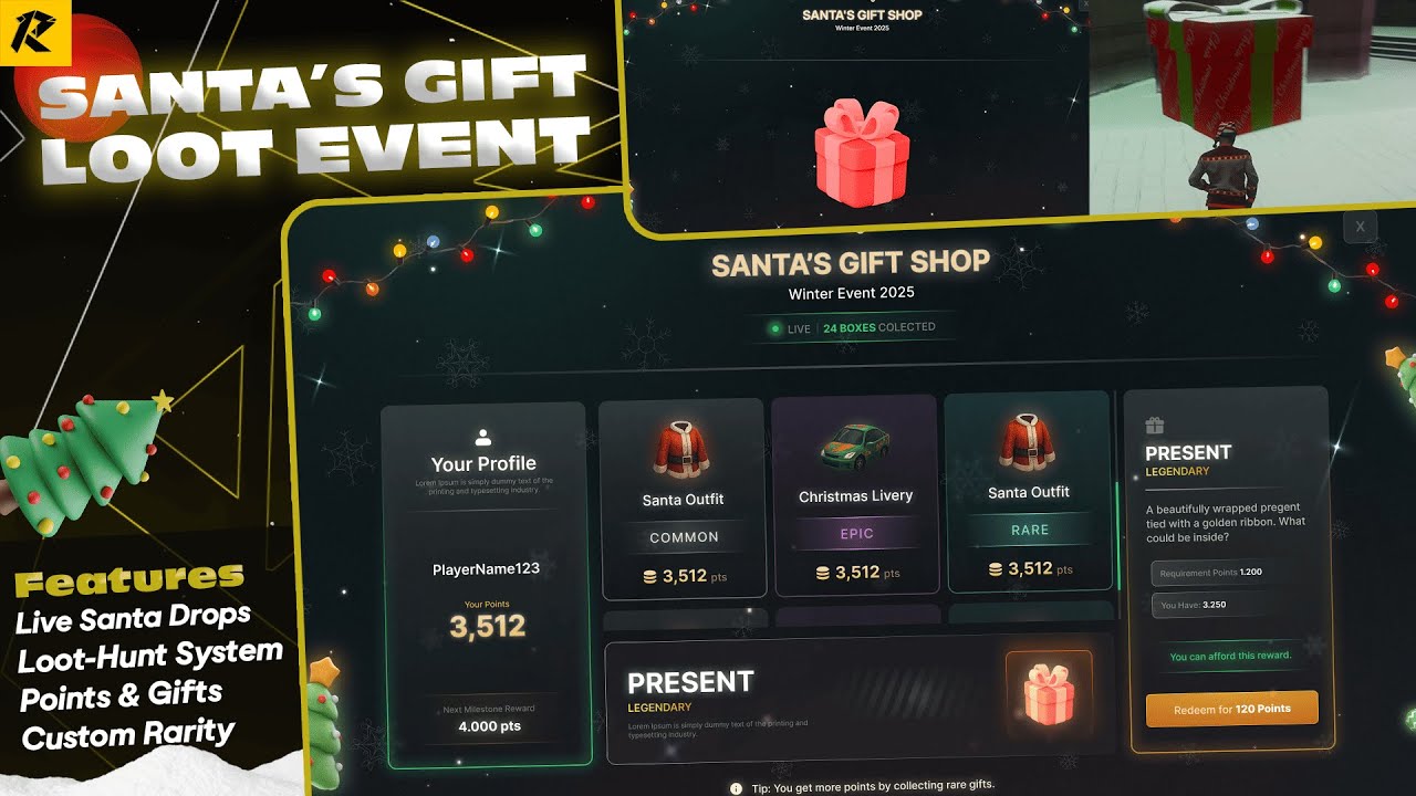 Turn Christmas into a competitive, reward-driven event with live Santa drops, unique gift crates, persistent points, and a fully configurable seasonal shop.