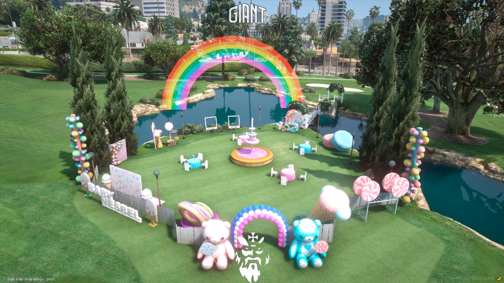 The event takes place in a park or garden, surrounded by lush trees and colorful flowers. The sky is clear, adorned with white clouds and a vibrant rainbow stretching across the horizon.